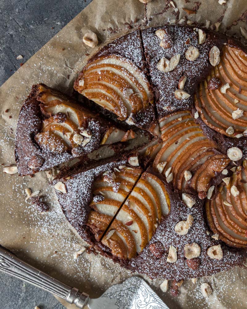 - Pour batter into a greased 9-inch springform pan. Decorate top with pear slices by gently fanning them out, small amounts at a time. Vary the direction and spacing to create a pattern. Brush pears with maple syrup. Sprinkle cake with hazelnuts.